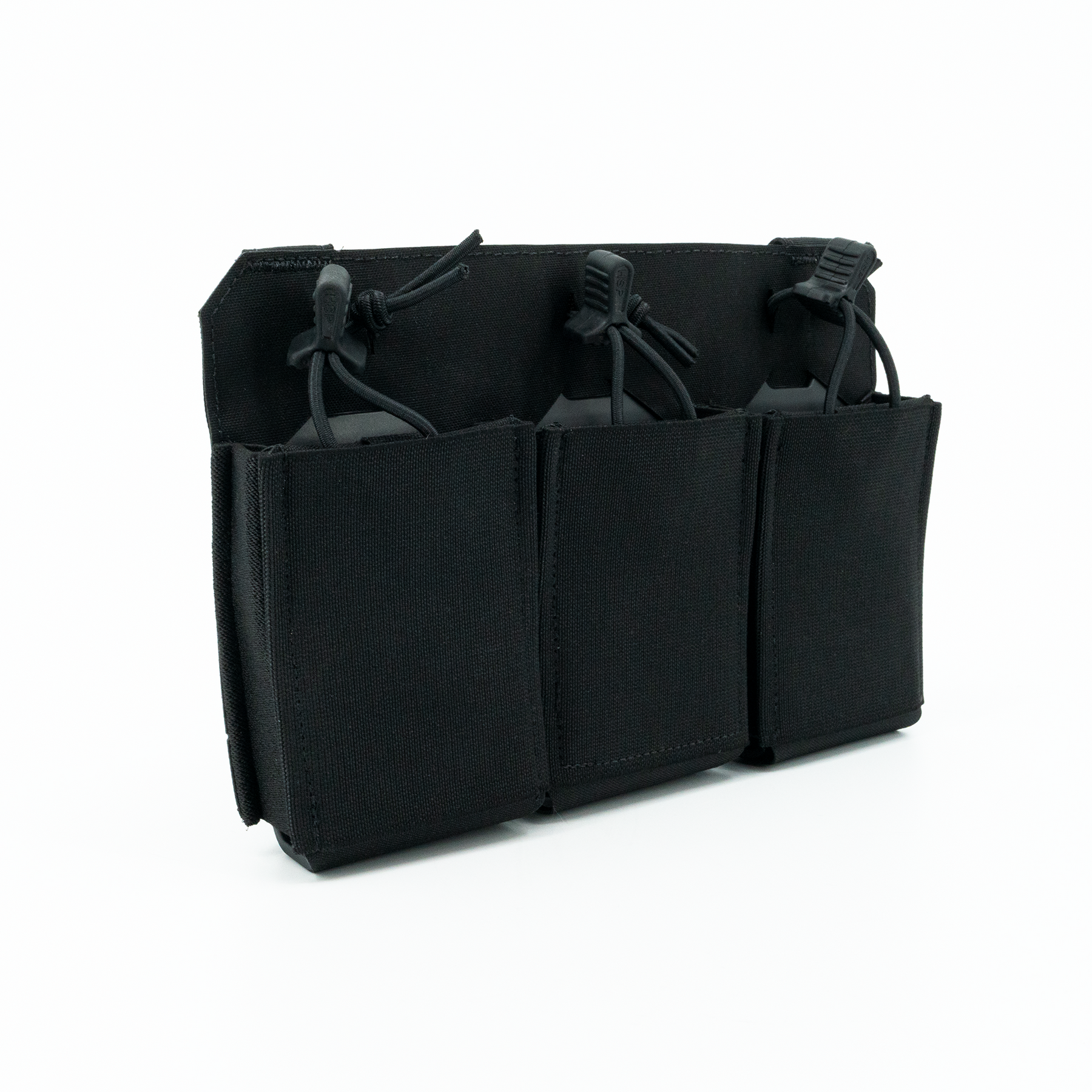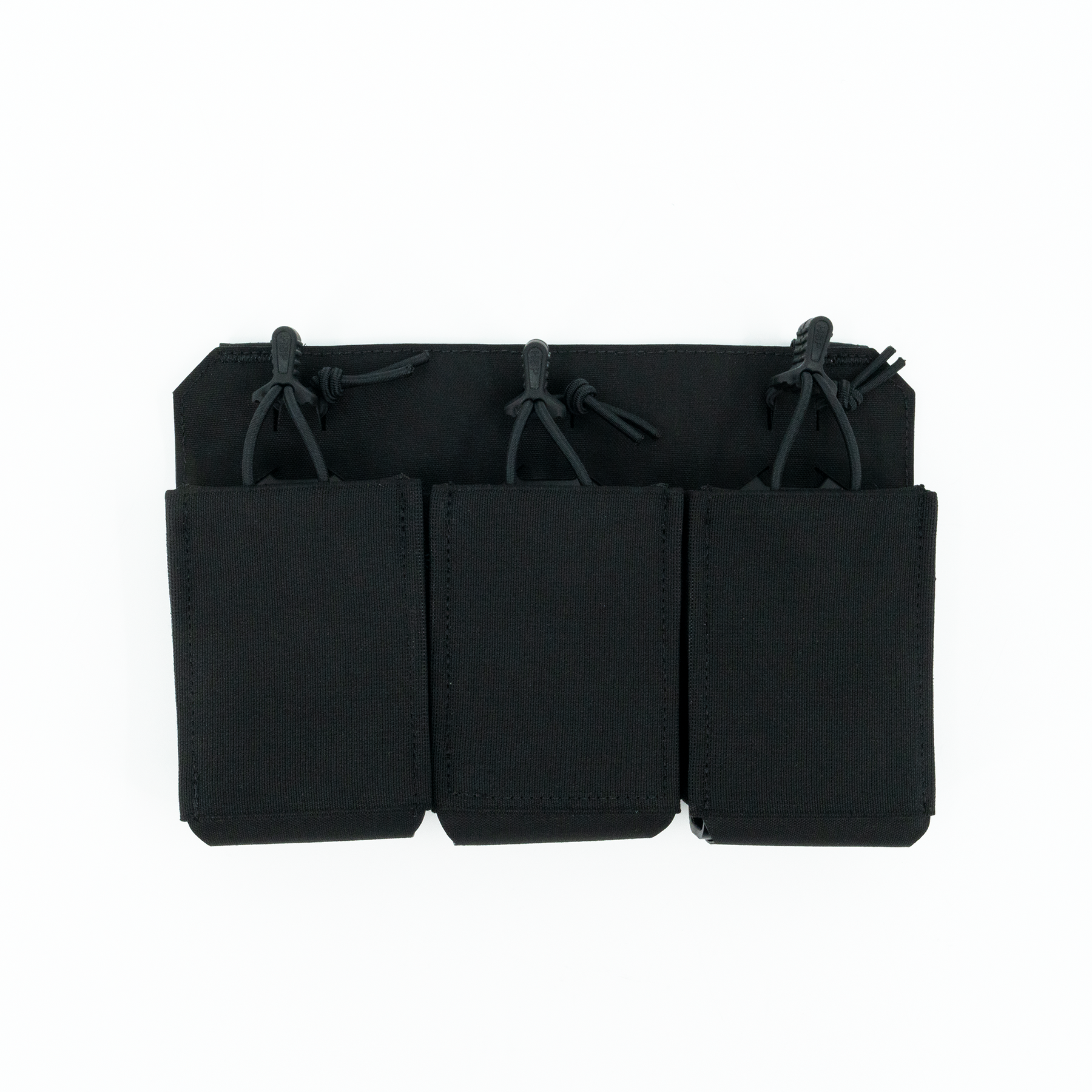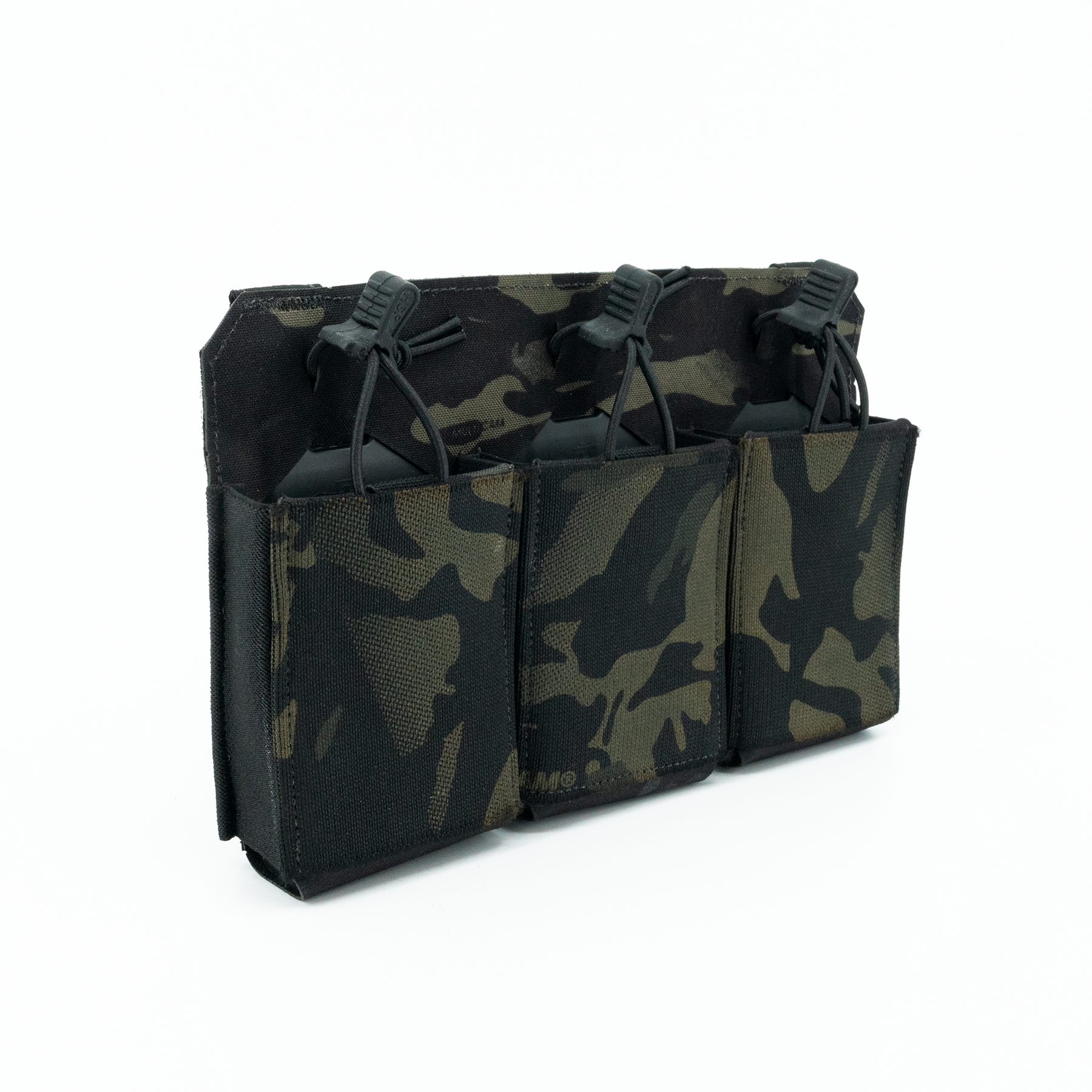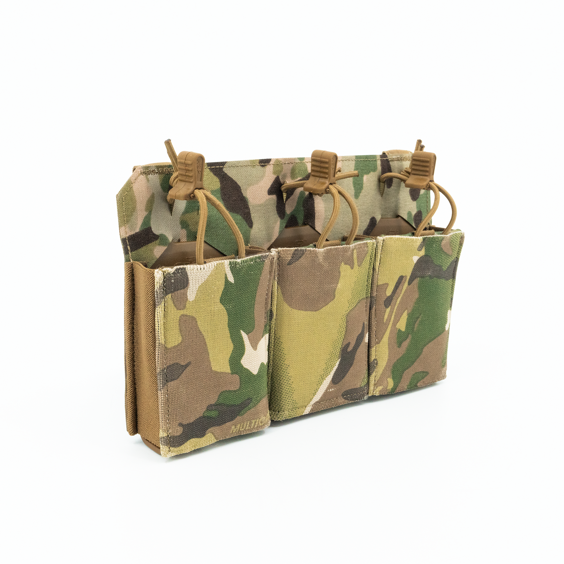 The three-magazine placard comes standard with proprietary MP2 inserts allowing secure retention of most 5.56x45, 5.45x39, 7.62x35, 7.62x39 and 7.62x51 rifle magazines without the need for bungies or flaps. The positive click-in magazine pouch delivers a smooth draw without impacting the ability to quickly reindex partial magazines during tactical reload. The MP2s are also removable, allowing the operator to place radios, laser range finders, or medical kits within the enclosed space. The TRMP includes three woven elastic pouches on the front of the placard, two pass through and a single closed pouch, creating secure storage for additional magazines, tourniquet, shock tubes, charges, maps, compass, chemlights or other essential kit while maintaining an incredibly lightweight and slim profile. If additional load out is required, the optional TRMP-AMP (Auxiliary MOLLE Panel) can be added on the front of the TRMP creating a 1/2" MOLLE field (6 Columns with 7 Rows).