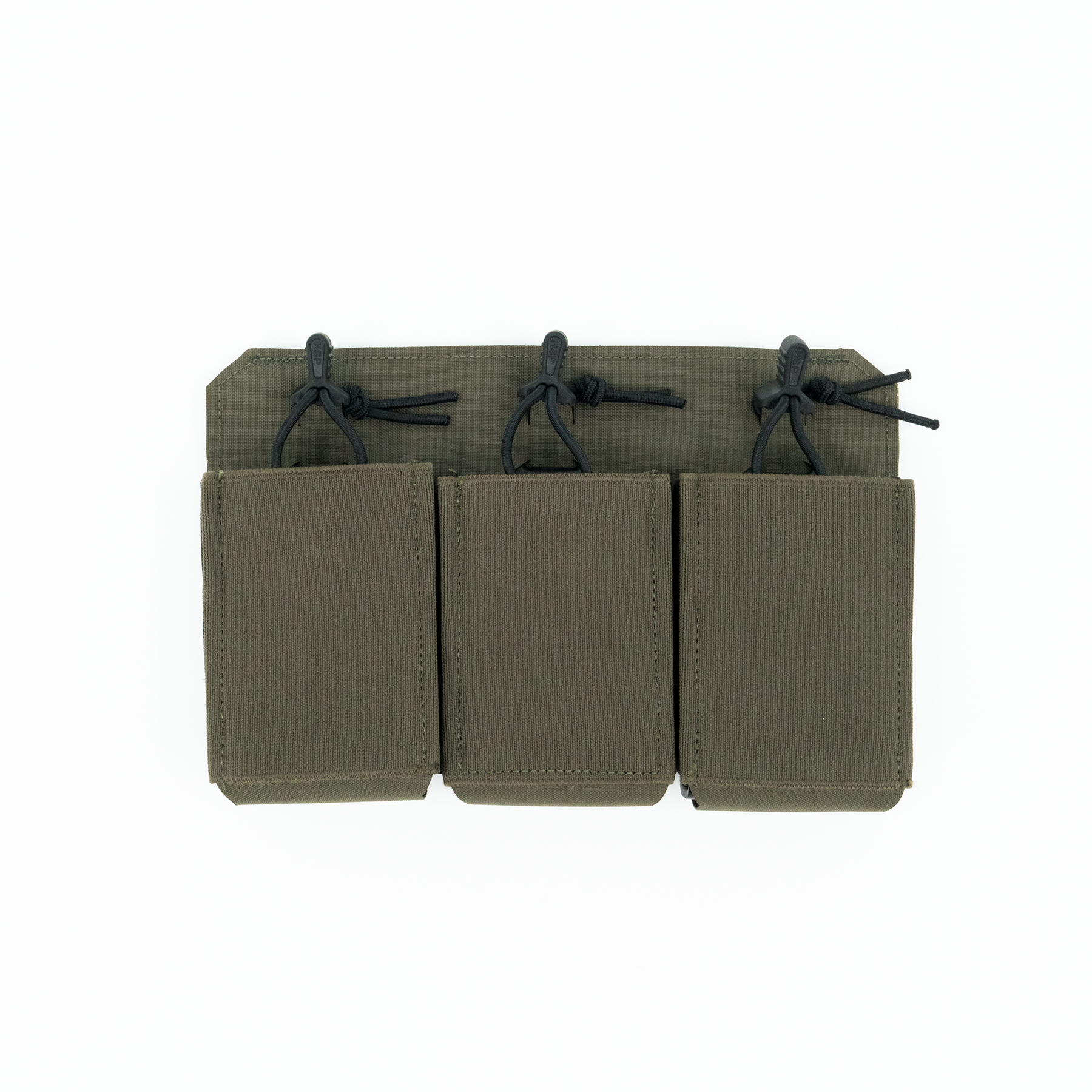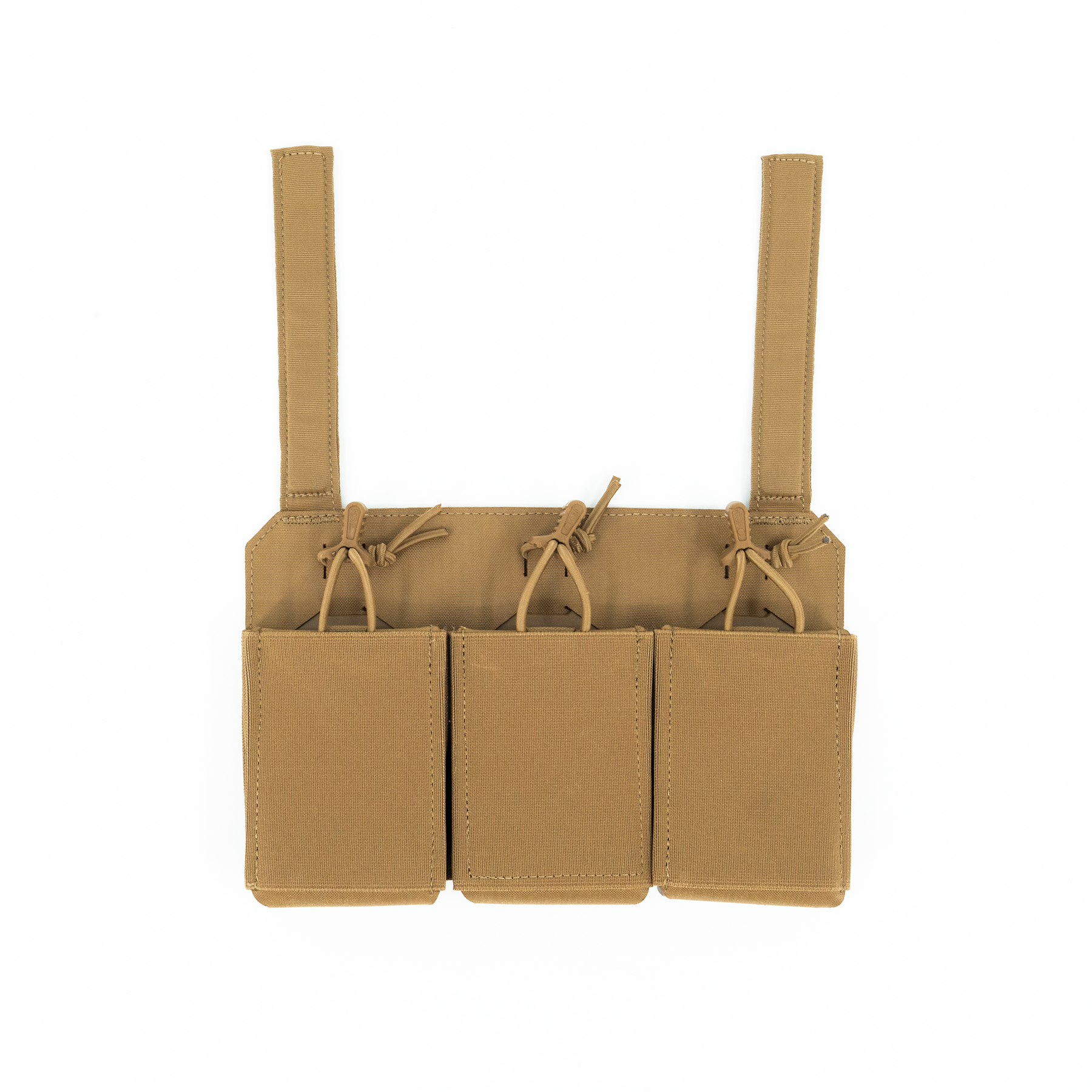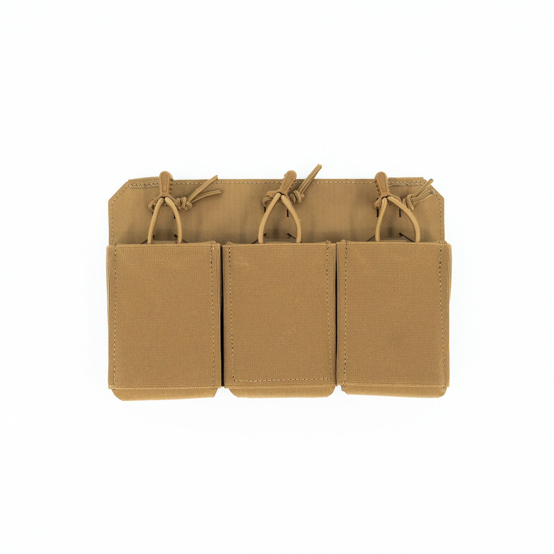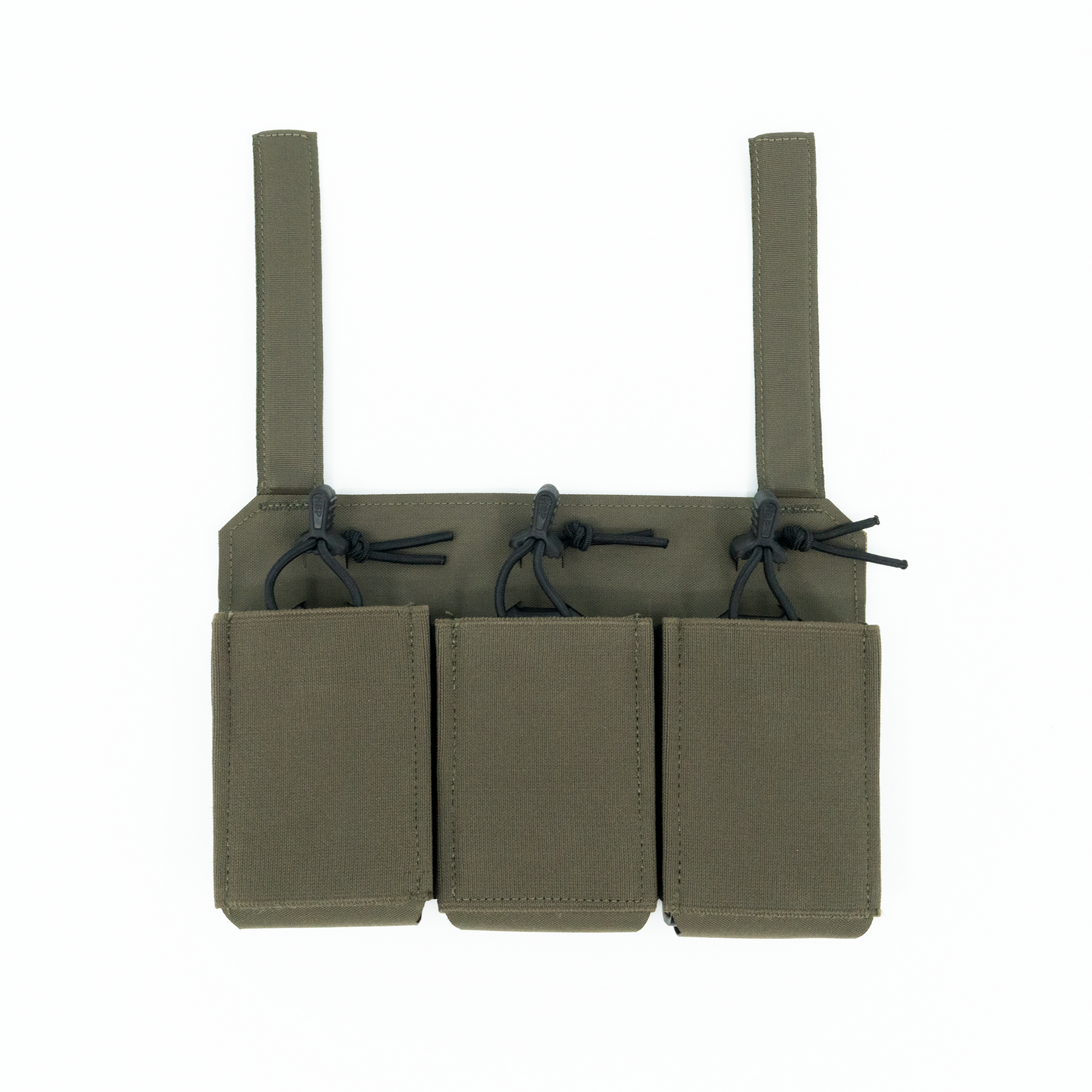 The three-magazine placard comes standard with proprietary MP2 inserts allowing secure retention of most 5.56x45, 5.45x39, 7.62x35, 7.62x39 and 7.62x51 rifle magazines without the need for bungies or flaps. The positive click-in magazine pouch delivers a smooth draw without impacting the ability to quickly reindex partial magazines during tactical reload. The MP2s are also removable, allowing the operator to place radios, laser range finders, or medical kits within the enclosed space. The TRMP includes three woven elastic pouches on the front of the placard, two pass through and a single closed pouch, creating secure storage for additional magazines, tourniquet, shock tubes, charges, maps, compass, chemlights or other essential kit while maintaining an incredibly lightweight and slim profile. If additional load out is required, the optional TRMP-AMP (Auxiliary MOLLE Panel) can be added on the front of the TRMP creating a 1/2" MOLLE field (6 Columns with 7 Rows).