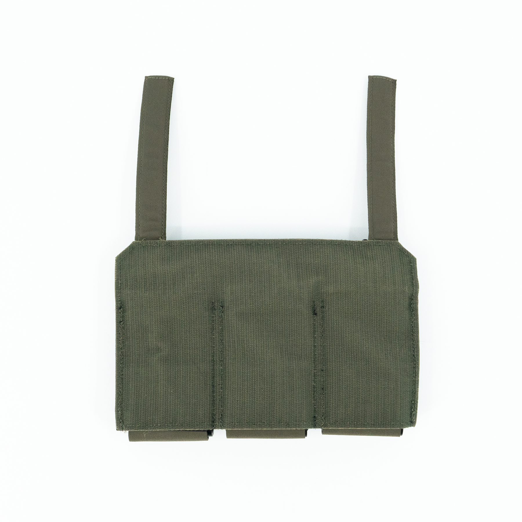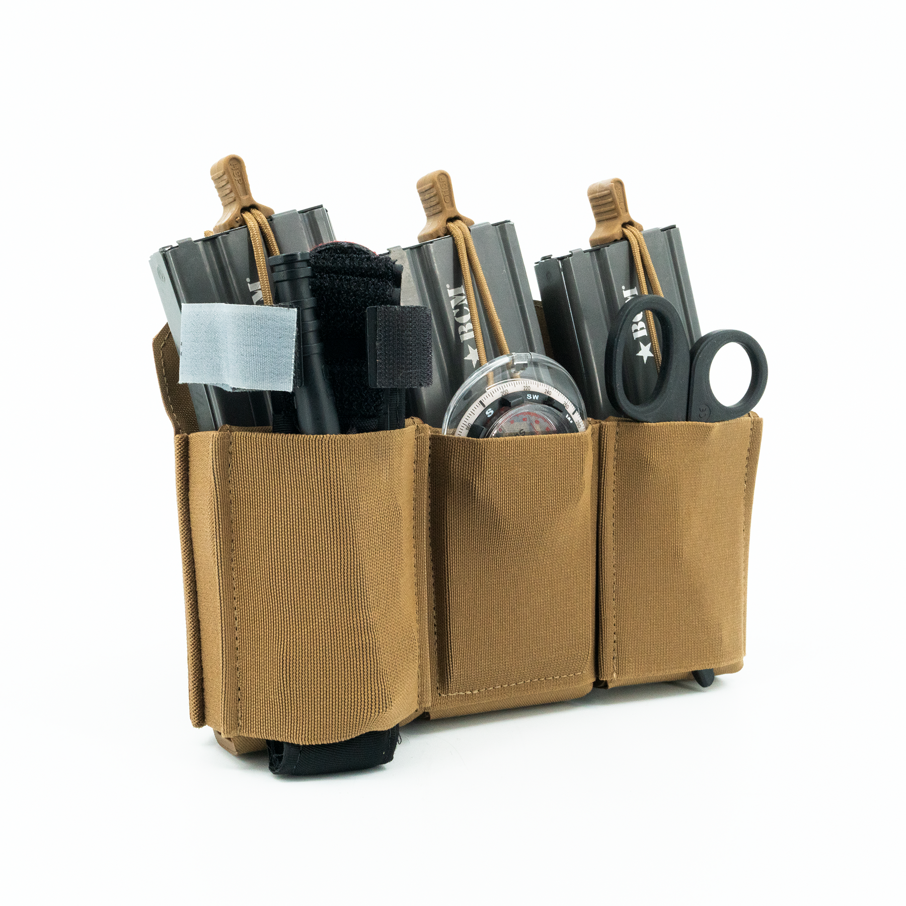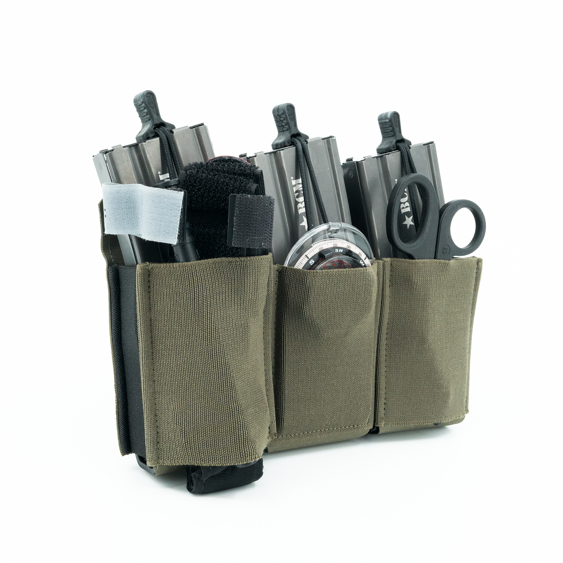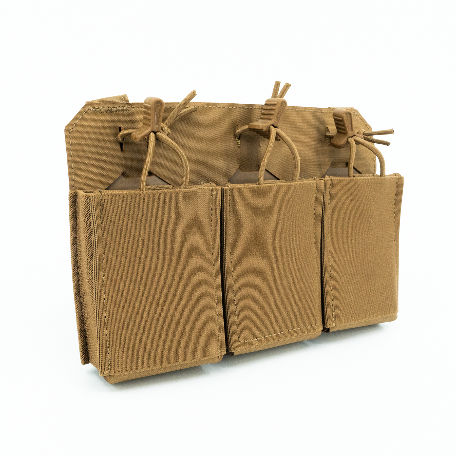 The three-magazine placard comes standard with proprietary MP2 inserts allowing secure retention of most 5.56x45, 5.45x39, 7.62x35, 7.62x39 and 7.62x51 rifle magazines without the need for bungies or flaps. The positive click-in magazine pouch delivers a smooth draw without impacting the ability to quickly reindex partial magazines during tactical reload. The MP2s are also removable, allowing the operator to place radios, laser range finders, or medical kits within the enclosed space. The TRMP includes three woven elastic pouches on the front of the placard, two pass through and a single closed pouch, creating secure storage for additional magazines, tourniquet, shock tubes, charges, maps, compass, chemlights or other essential kit while maintaining an incredibly lightweight and slim profile. If additional load out is required, the optional TRMP-AMP (Auxiliary MOLLE Panel) can be added on the front of the TRMP creating a 1/2" MOLLE field (6 Columns with 7 Rows).